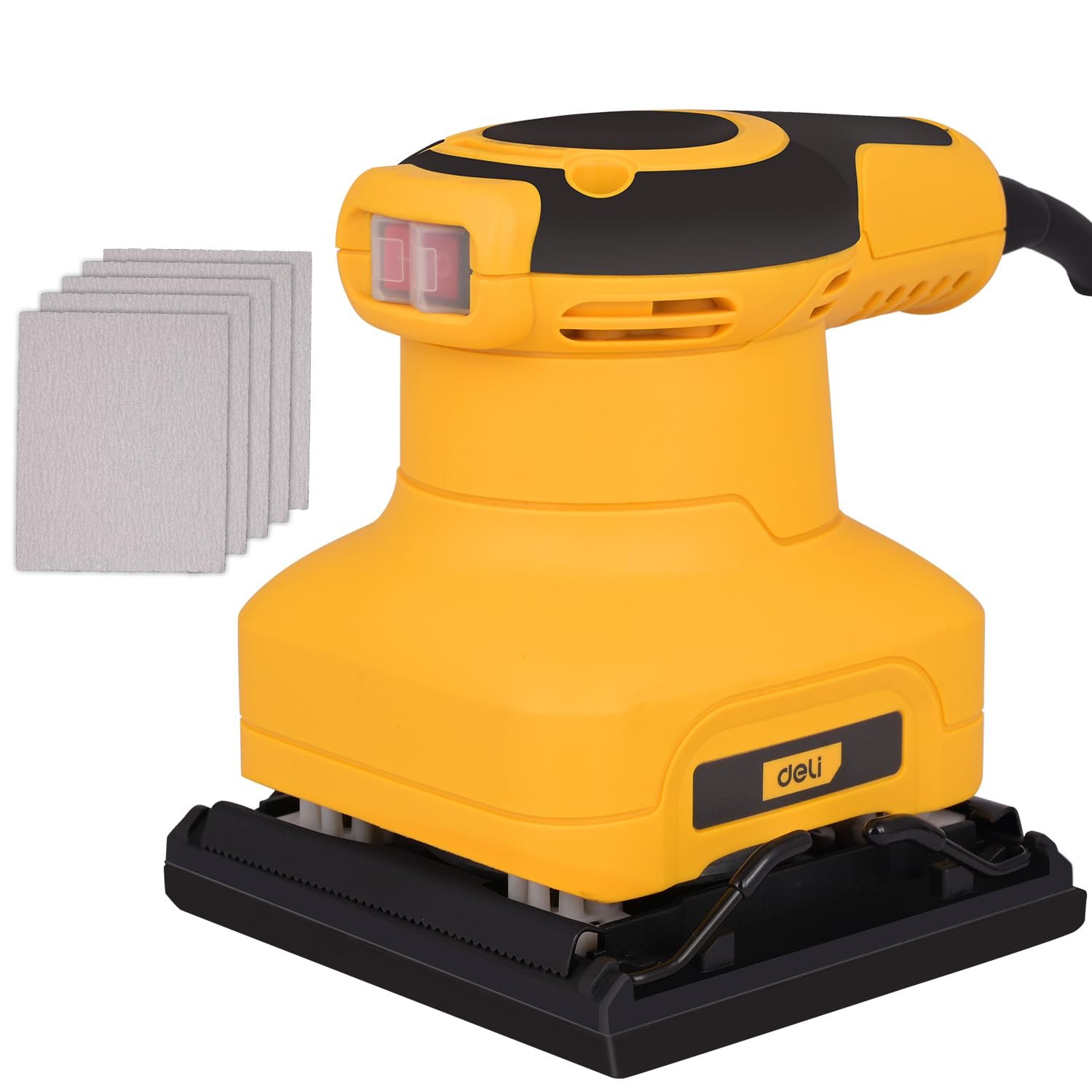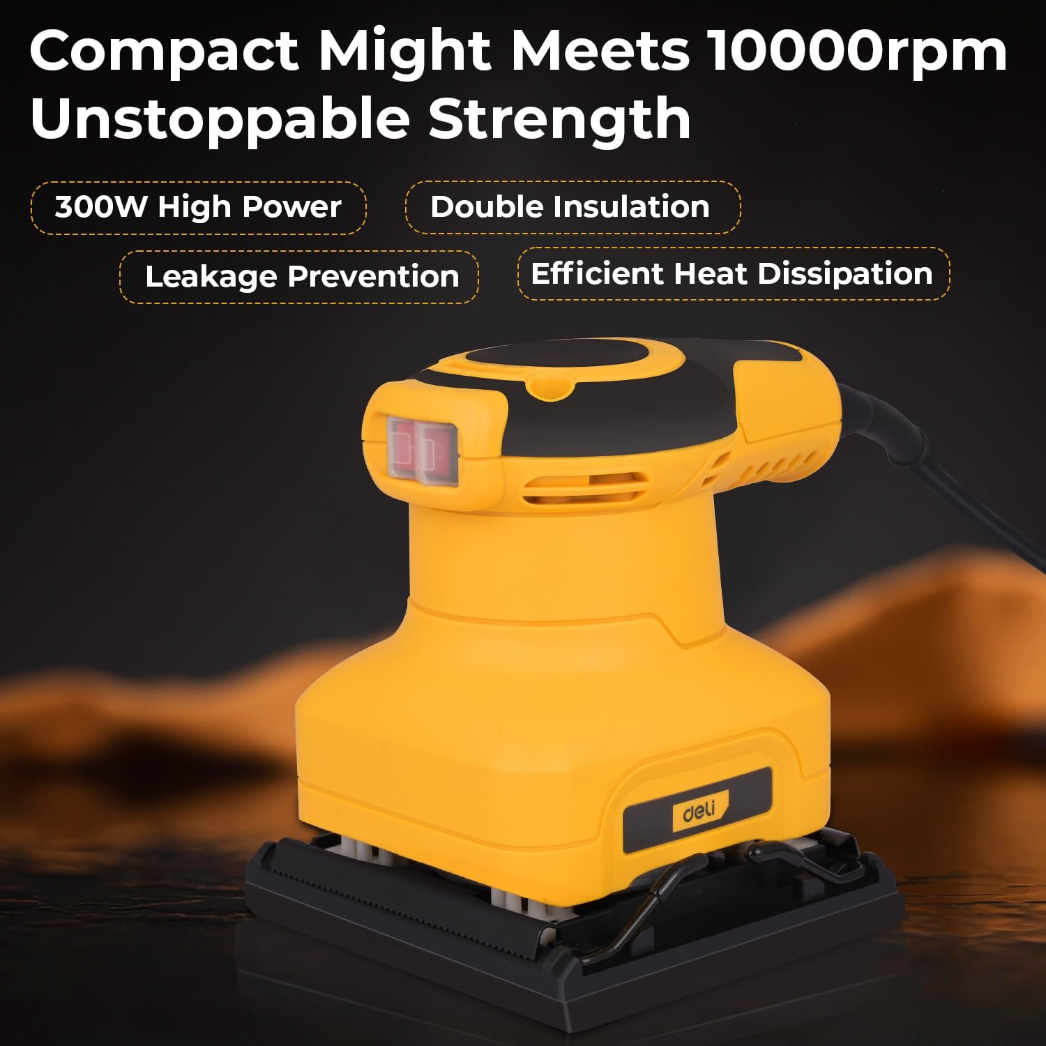 • COMPACT SIZE, STRONG POWER: The Deli Palm Sander packs a punch with its robust 300W motor, delivering powerful performance in a compact form. Its ergonomic design ensures comfortable handling and effortless manoeuvrability, making it ideal for both intricate detailing and extensive sanding tasks.