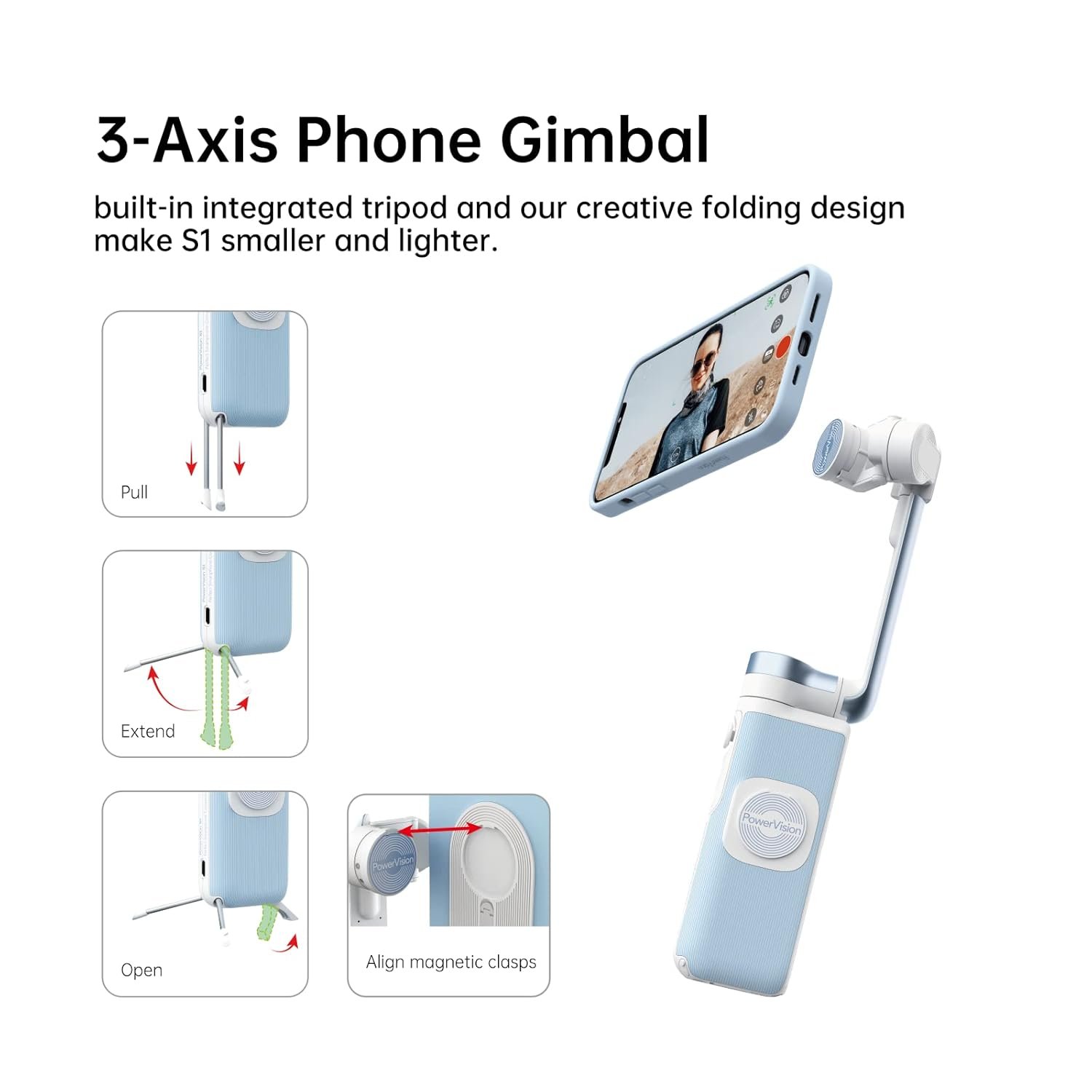 PowerVison S1 mini but Powerful. The perfect companion for Smartphones. Recognizes the person in focus using visual AI technology and deep learning to deliver fast and accurate tracking. With in-app photography, editing, and sharing. User-friendly interface, plenty of background music, filters, and templates. Intelligent Mounting System. Built-in tripod frees up your hands while you make the magic happen. Gesture control and AI tracking keep you in the center like a star during live streaming, conference calls, and video chats. With a powerful gimbal motor with an efficient folding solution to reach perfect balance and compactness.
